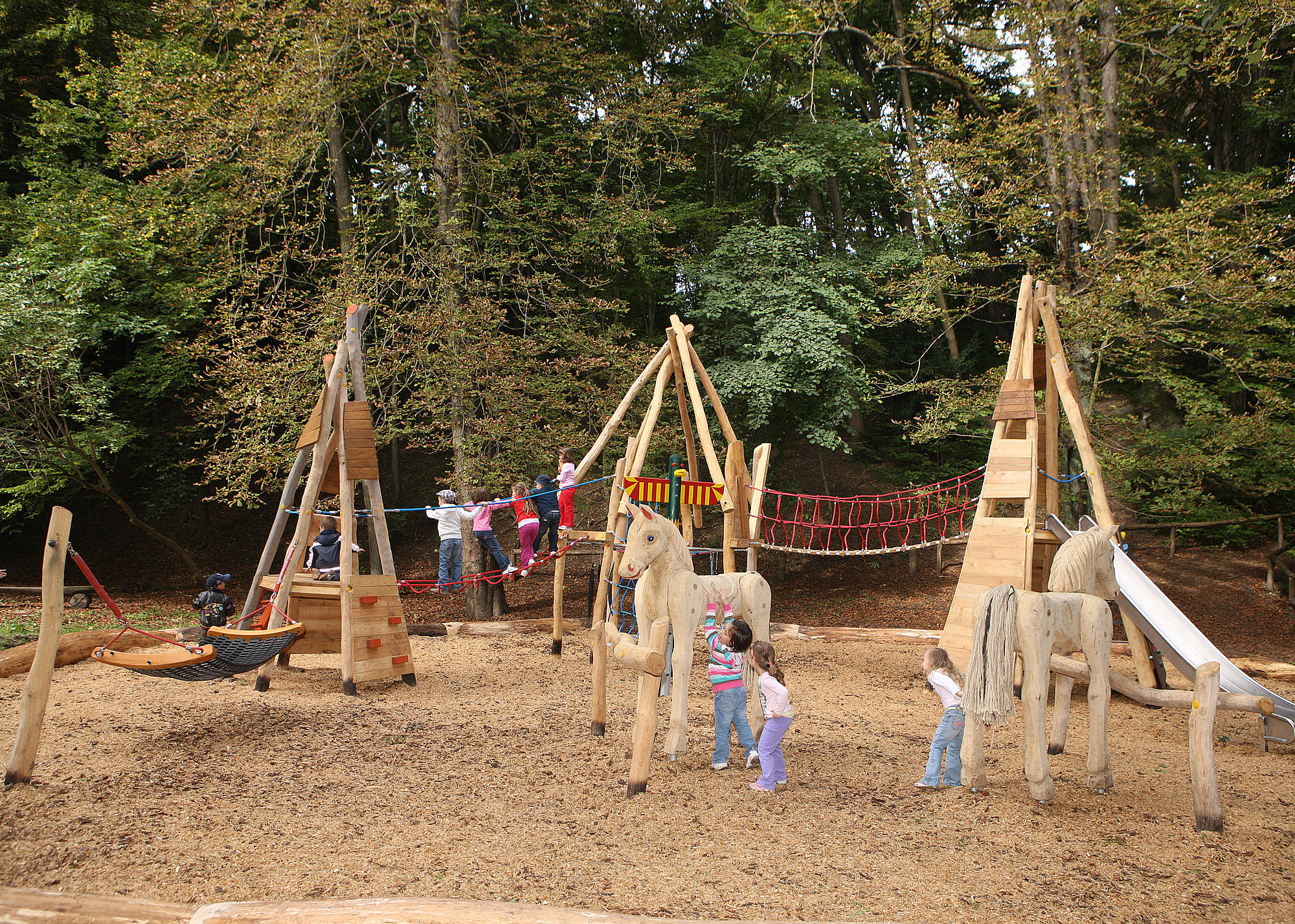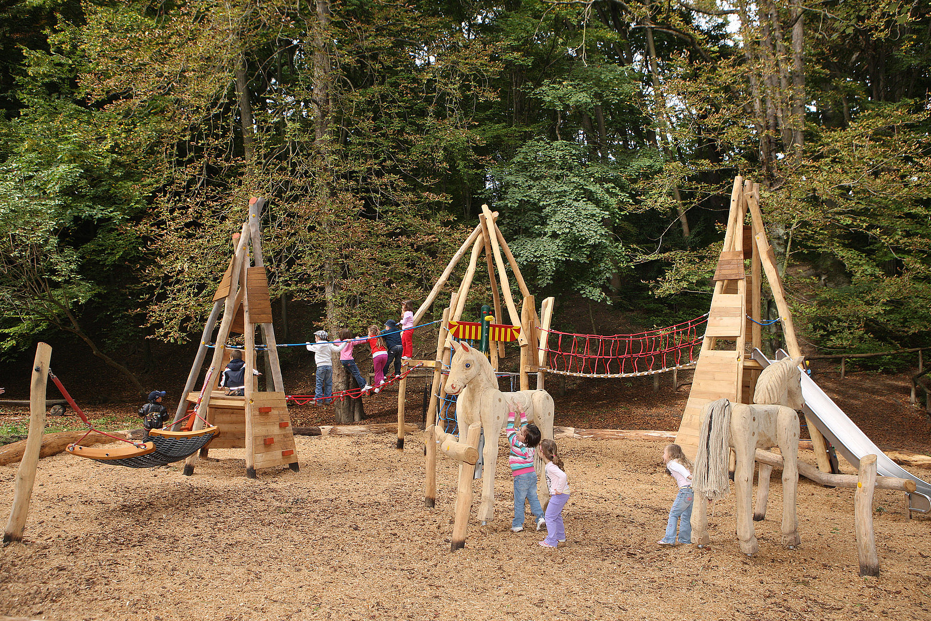 Am Waldspielplatz im Dehnepark ist es durch die vielen Laubbäume relativ schattig und frisch. Mit etwas Glück kann man sogar den Rosenbach plätschern hören, der durch den Park verläuft. Ein ruhiger Platz mit viel Grün zum Regenerieren und Entspannen der Eltern.