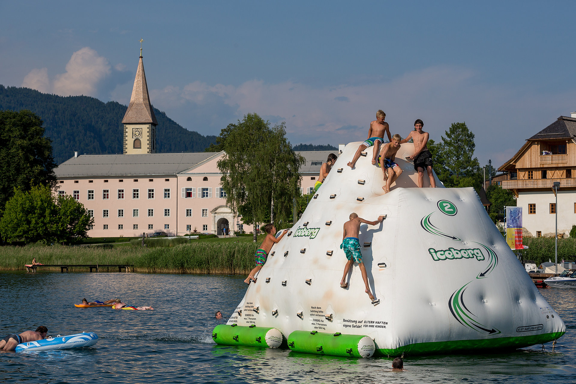 Eltern und Kinder erwartet im Erlebnisbad Ossiach Badevergnügen und Abwechslung. Langeweile kommt hier bestimmt nicht auf: Die besondere Attraktion ist die 93 m lange Wasserrutsche mit eingebauten Jumps. Aber auch die anderen Freizeitaktivitäten sorgen für Spiel, Spaß und Action im Erlebnisbad in Ossiach. Der große Badesteg führt weit in den See hinaus. Auch ein Sprungangebot ist hier für Sportbegeisterte vorhanden. Im Wasser selbst heißt es dann den 4,5 m hohen schwimmenden Eisberg zu erklimmen. Auf drei Seiten geht es hinauf, die vierte Seite dient als Rutschbahn hinunter in den Ossiacher See. Für die Sonnenanbeter ist eine schöne Liegewiese angelegt, eine natürliche Bepflanzung sorgt für den wichtigen Schatten an heißen Sommertagen. Die Sonnenterrasse bietet sich an, wenn Kinder nach einer Stärkung verlangen oder den Eltern nach einer gemütlichen Kaffeepause ist.