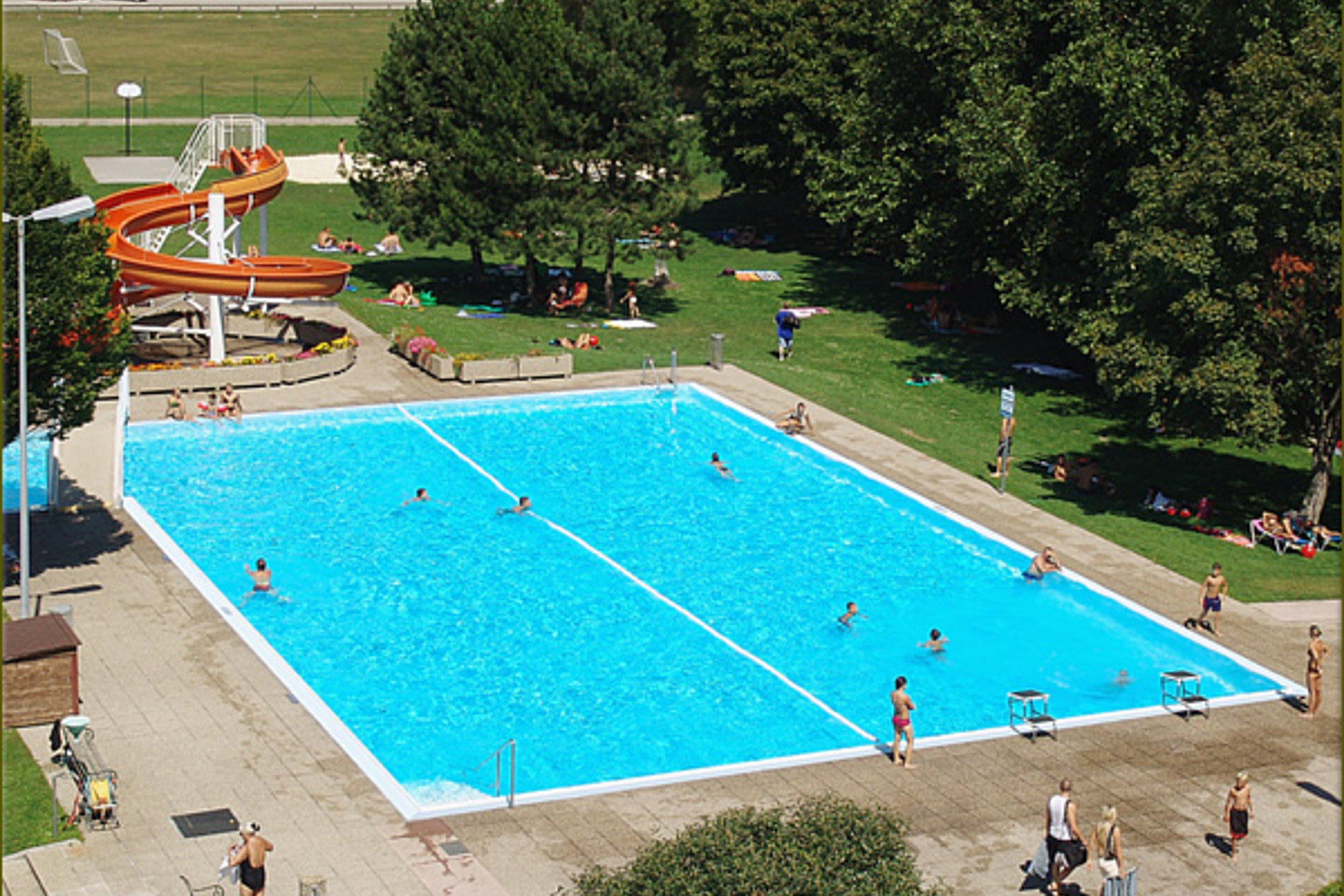 Vorwärmeanlage aus Solarenergie, Schwimmer- und Nichtschwimmerbecken, 40m Wasserrutsche, 20.000m² Liege- und Spielwiesen, gut geführte Kantine, Kinderplanschbecken, Kinderschwimmkurse, Grandertechnologie (seit 2004).