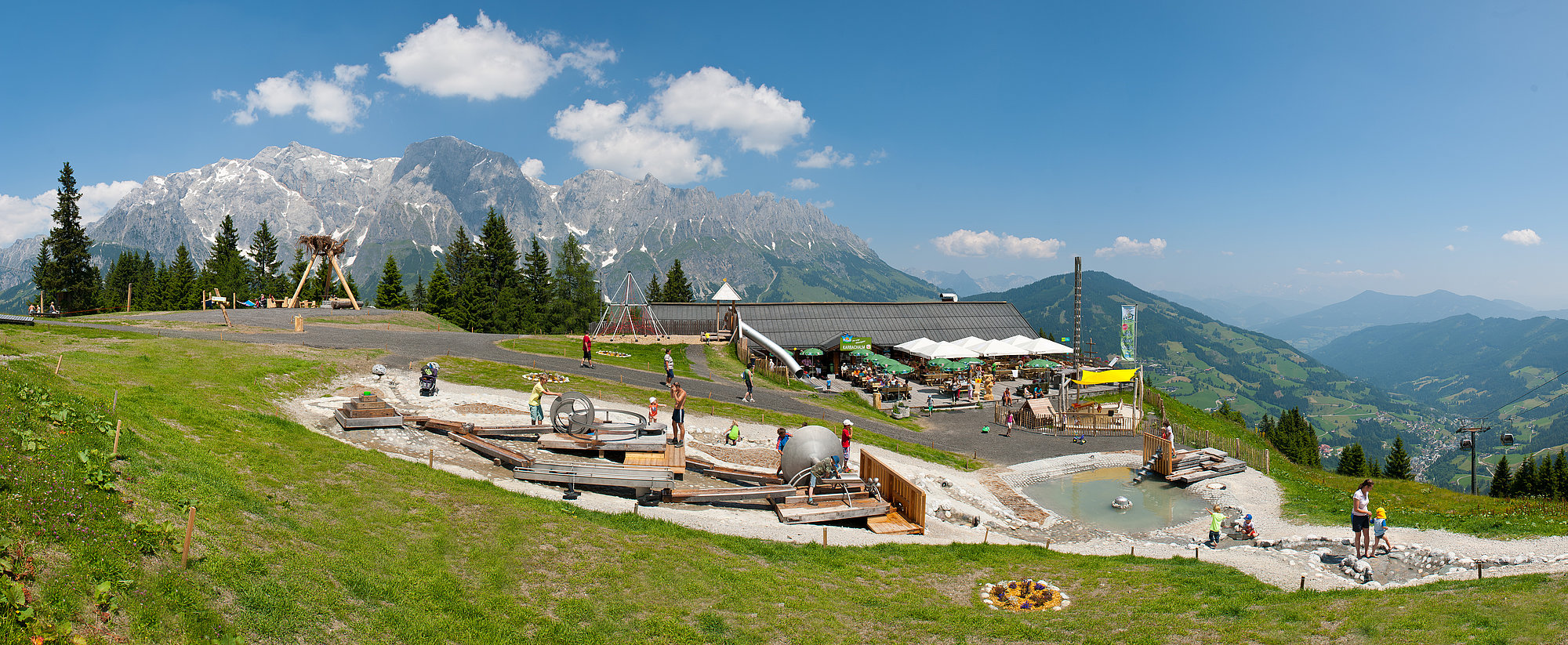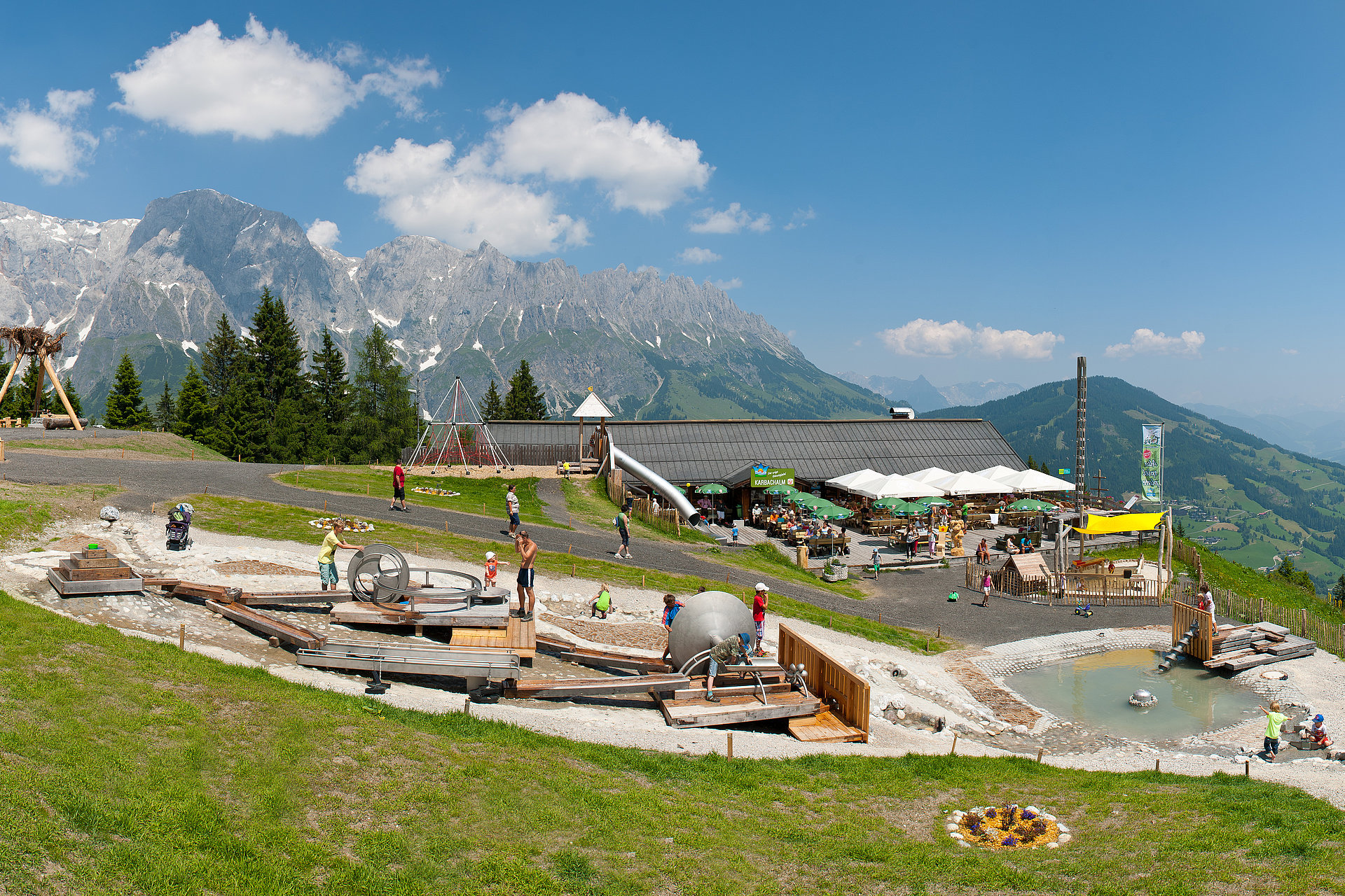 Auf geht´s ... die Kabinenbahn Karbachalm bringt euch in wenigen Minuten bequem zu Toni´s Almspielplatz. Dort oben lassen zahlreiche Spielstationen jedes Kinderherz höher schlagen. Im eigenen Wasser- und Sandspielplatz können die Kleinsten ihrer Kreativität freien Lauf lassen, während die "Großen" die Gastfreundschaft und das kulinarische Angebot der Karbachalm genießen können. Natürlich darf auch einer kleinen Wanderung nichts im Wege stehen - und das im wahrsten Sinne des Wortes - denn der umliegende Wanderweg wurde barrierefrei gestaltet, damit Sie auch mit dem Kinderwagen bequem spazieren können. Sie genießen dabei ein einzigartiges Panorama - und auch Ihre Kids werden diese Wanderung lieben, weil auf der gesamten Strecke lustige Spielgeräte für viel Spaß und Abenteuer sorgen. Also dann viel Spaß!