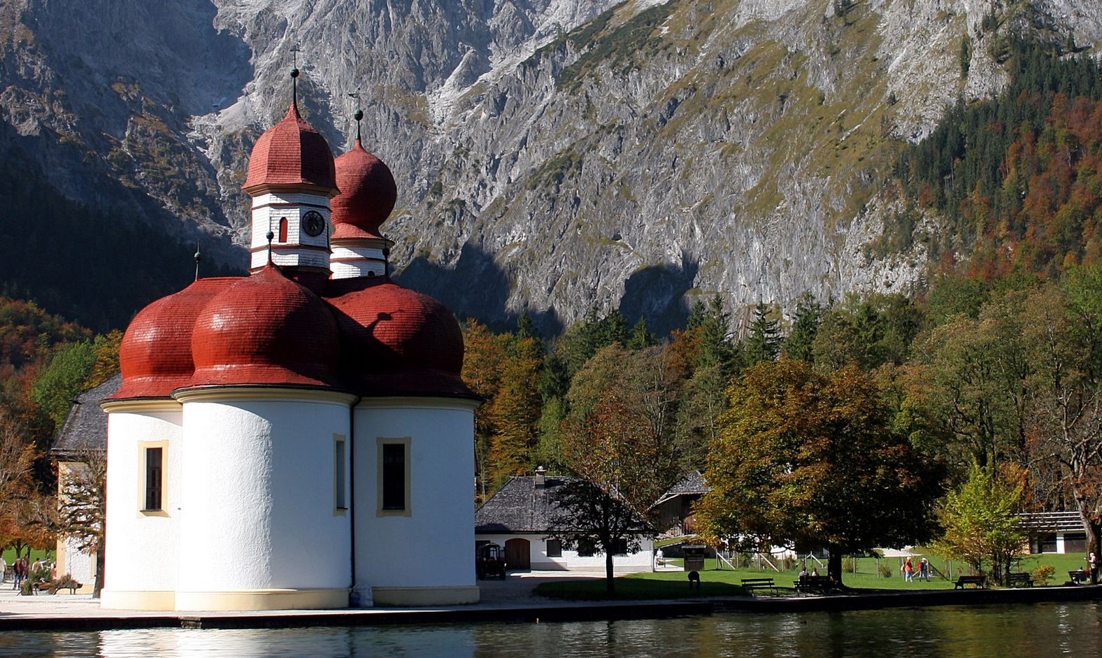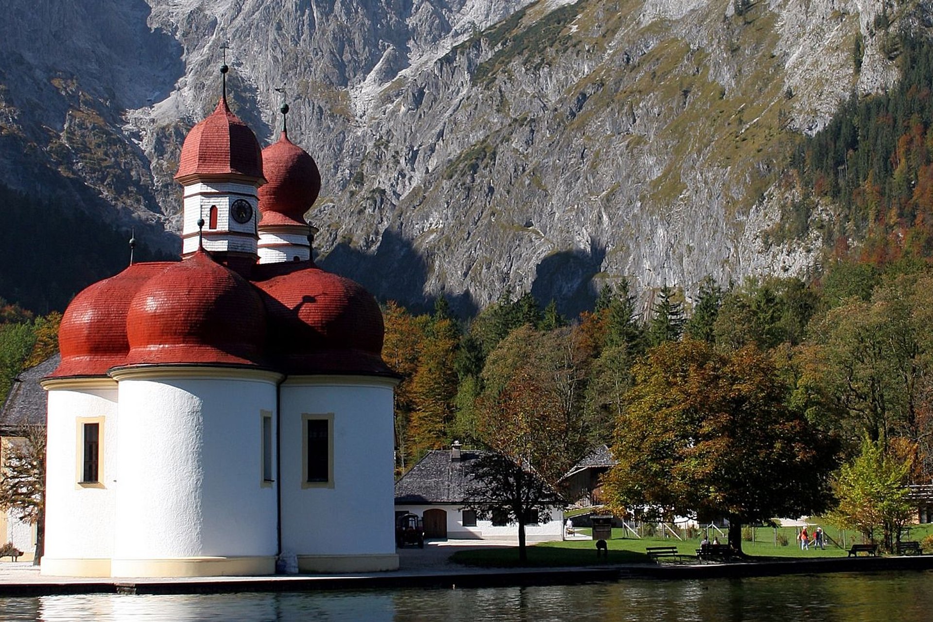 In St. Bartholomä beeindruckt die hübsche Wallfahrtskirche vor der imposanten Watzmann-Ostwand, der höchsten Felswand der Ostalpen.