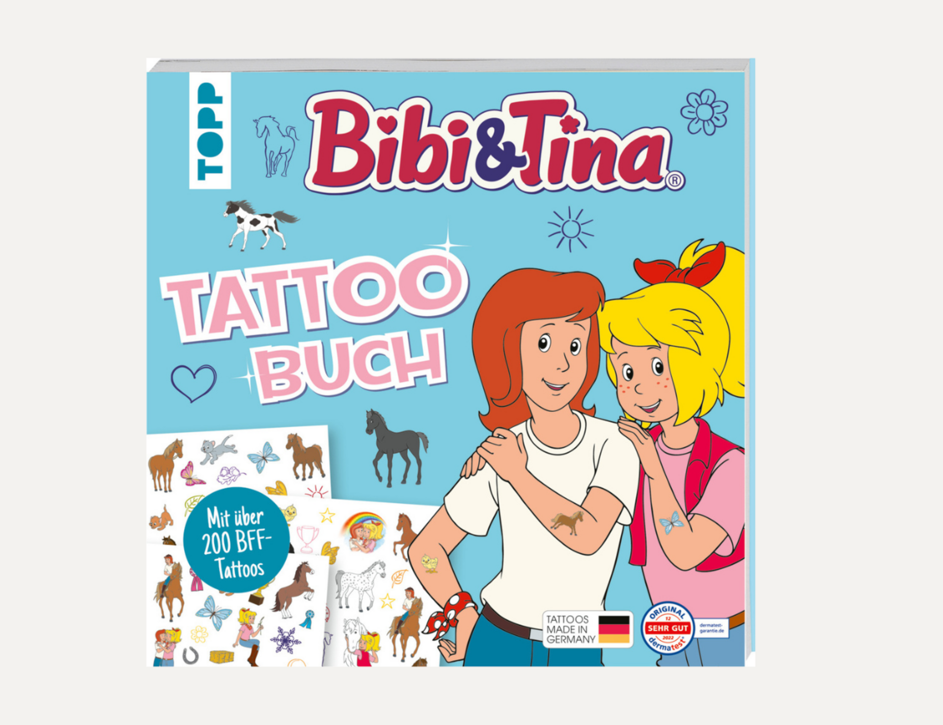 Die Tattoos mit Motiven aus der Welt von Bibi & Tina sind leicht aufzutragen und verschwinden nach einer Weile wieder von selbst. Außerdem gibt es im Buch tolle Ausmalmotive, Rätsel und Infos rund um den Martinshof.
