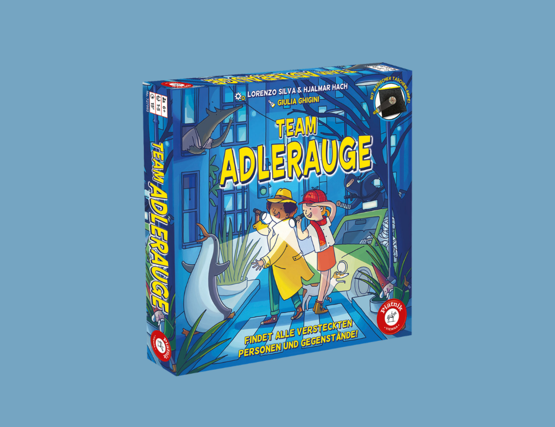 Es wird Nacht in der Stadt. Wer oder was treibt sich noch auf den dunklen Straßen herum? Bei „Team Adlerauge“ von Piatnik schnappen sich Kinder ihre magischen Taschenlampen und entdecken damit die Geheimnisse der Finsternis. Dabei müssen sie gut aufpassen, in jeden Winkel leuchten und die Uhr im Blick behalten, denn der Mond ist bereits aufgegangen und zur Schlafenszeit müssen alle wieder zuhause sein …