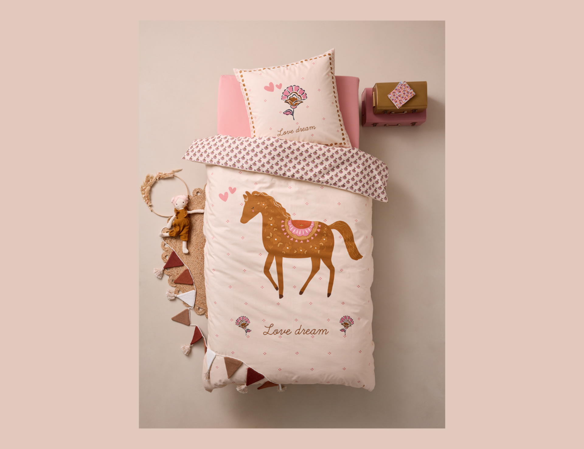 Gut eingekuschelt in dieser wunderschönen Bettwäsche, träumt man vielleicht vom nächsten Pferdeabenteuer. Die Wendebettwäsche mit Blumen- und Pferdemotiv besteht zu 100 % aus Baumwolle.