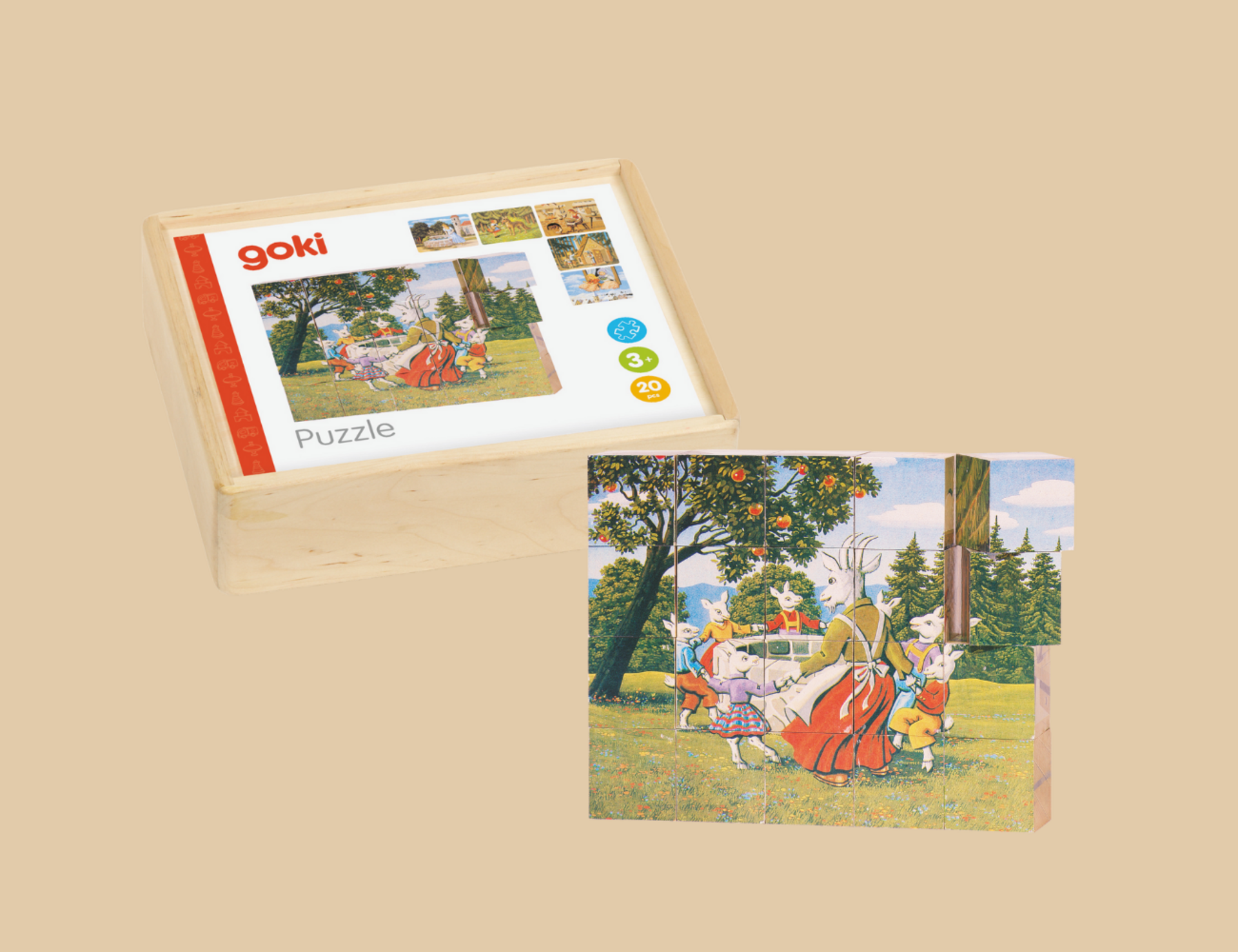Märchenhaft puzzeln Sechs bekannte Märchen können durch das Würfelpuzzle aus Holz dargestellt werden. Eine märchenhafte Herausforderung mit 20 Würfelteilen für kleine Puzzler ab drei Jahren.
