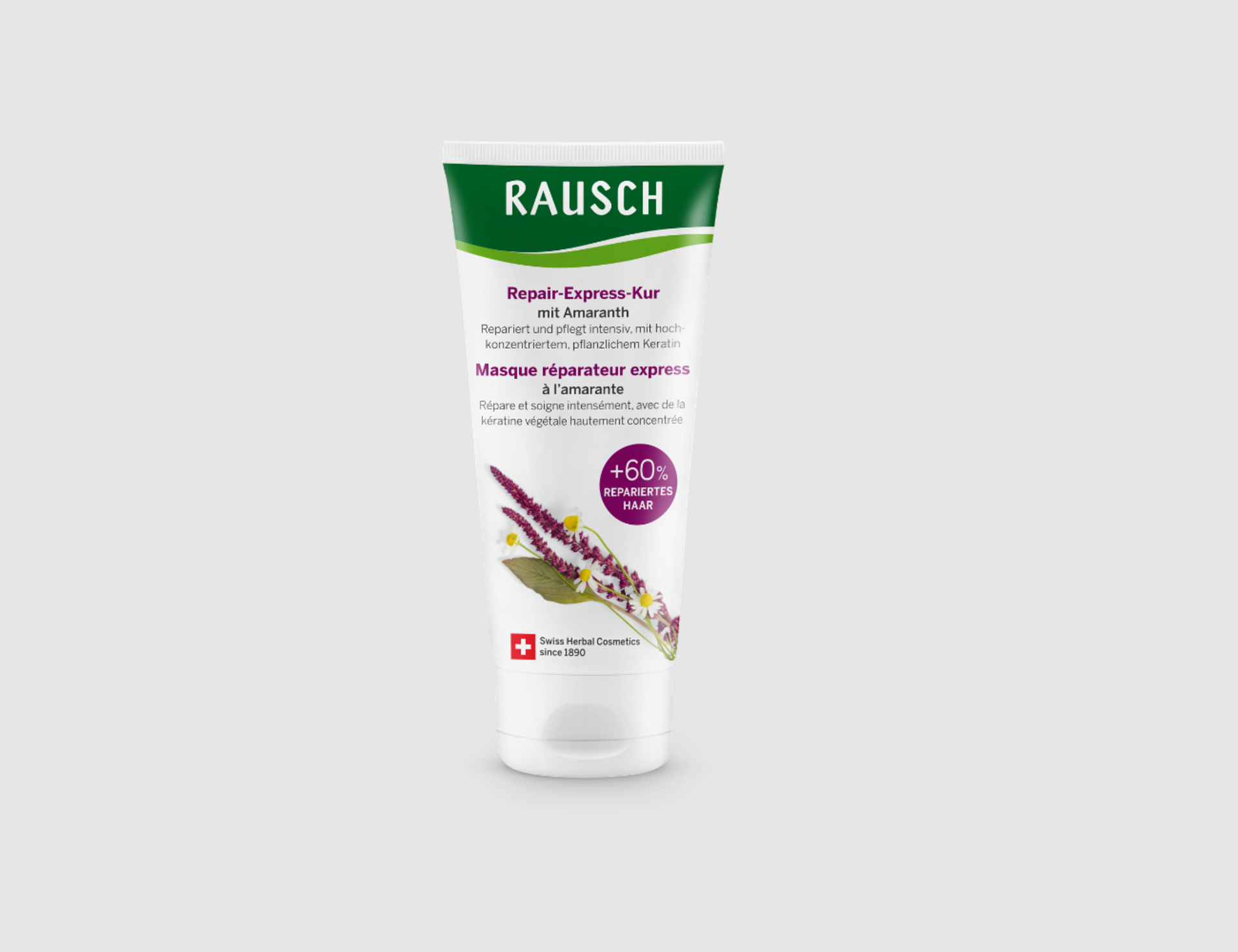 Die RAUSCH Repair-Express-Kur mit Amaranth ist eine schnell wirkende Intensiv-Haarkur, die speziell für strapaziertes, brüchiges Haar entwickelt wurde. Sie reduziert Haarbruch, stärkt die Protein-Matrix des Haares und stellt bis zu 60 % der geschädigten Haarstruktur wieder her – und das in nur einer Minute! Dank hochkonzentriertem, pflanzlichem Keratin sowie wertvollen Extrakten aus Amaranth, Kamillenblüten und Weizenkeimöl wird das Haar tiefenwirksam gepflegt, erscheint geschmeidig und glänzend – ganz ohne zu beschweren. Die Kur ist silikonfrei, vegan und besteht zu 97 % aus Inhaltsstoffen natürlichen Ursprungs, hergestellt in der Schweiz.