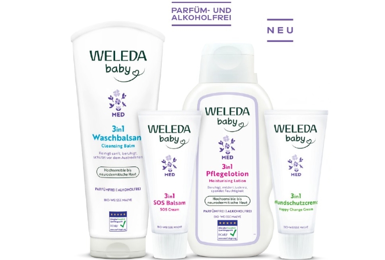 Die neue parfüm- und alkoholfreie Weleda baby MED Pflegeserie kombiniert die Kraft der Natur mit hochwirksamen Expertenformulierungen. Vom ersten Lebenstag an und für die ganze Familie. Die mit Hebammen, Dermatolog:innen und Apotheker:innen entwickelten Formulierungen unterstützen die Stärkung der Hautbarriere bei hochsensibler und zu Neurodermitis neigender Haut – für eine sanfte und gut verträgliche Pflegeroutine.