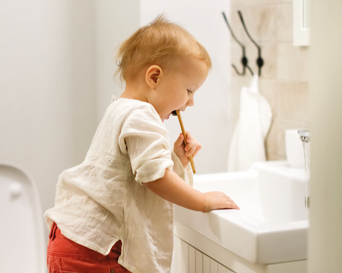 Die passende Zahnbürste für Kleinkinder hat einen kleinen Bürstenkopf, weiche Borsten und einen rutschfesten Griff.