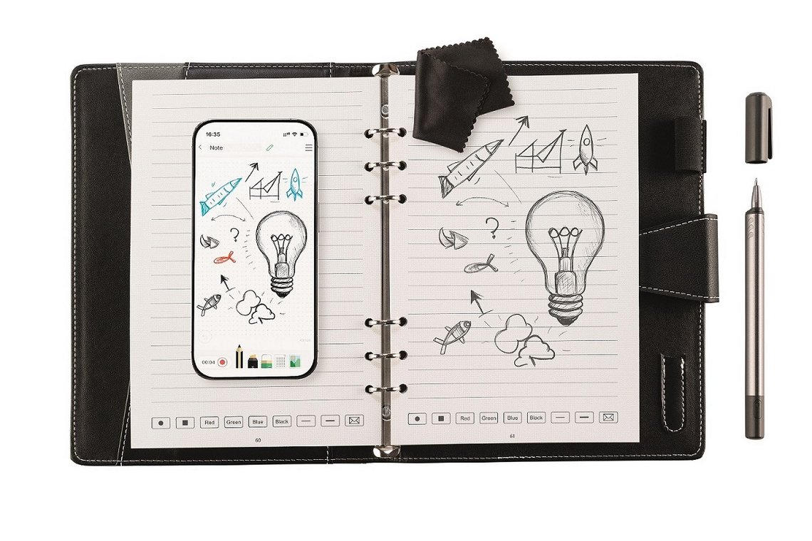 Der Smartpen kommt im Set mit einem hochwertigen Kunstleder-Notizbuch, dessen Seiten sich über 500-Mal wiederverwenden lassen – einfach mit einem feuchten Tuch löschen. Die Handschriftensynchronisation ermöglicht das Übertragen von Notizen und Zeichnungen in Echtzeit auf Smartphone oder Tablet. Notizen lassen sich offline speichern und bei Verbindung automatisch in der App sichern. Exportformate wie .pdf, .doc oder .txt machen die Weiterverarbeitung einfach – inklusive der Möglichkeit, Notizvideos für Präsentationen zu erstellen.