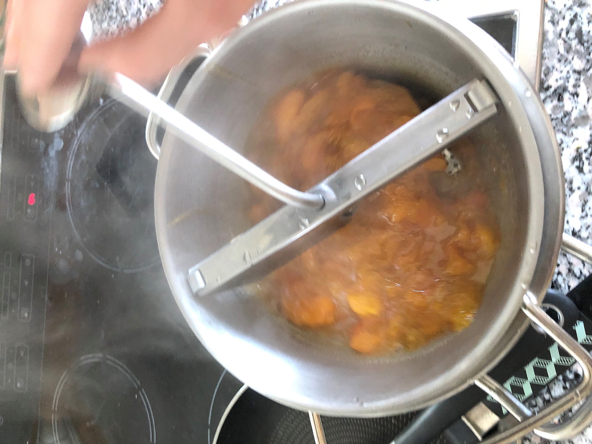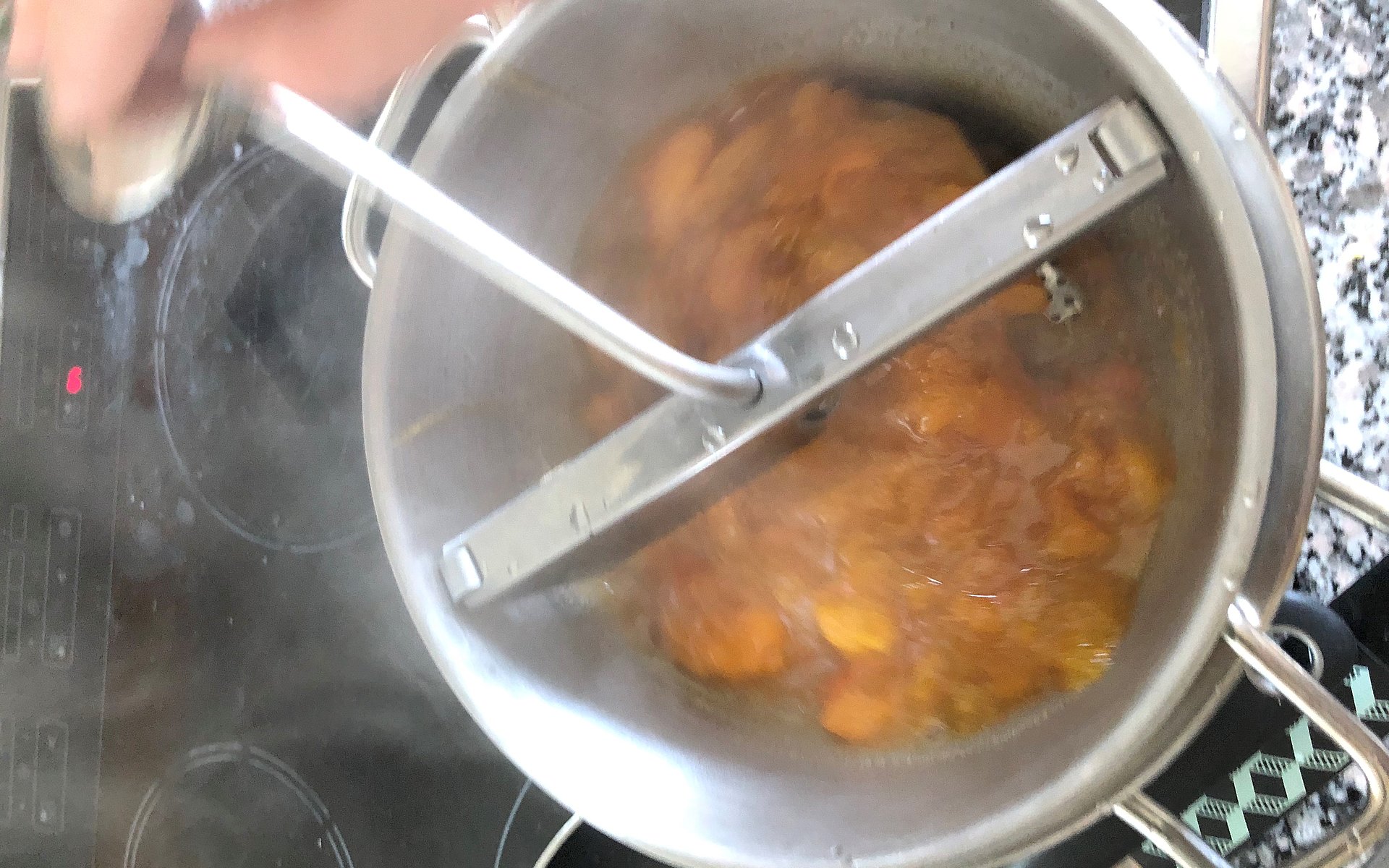 5. Das Marillen-Zuckergemisch passieren und für 7 Minuten zum Kochen bringen (gut umrühren).