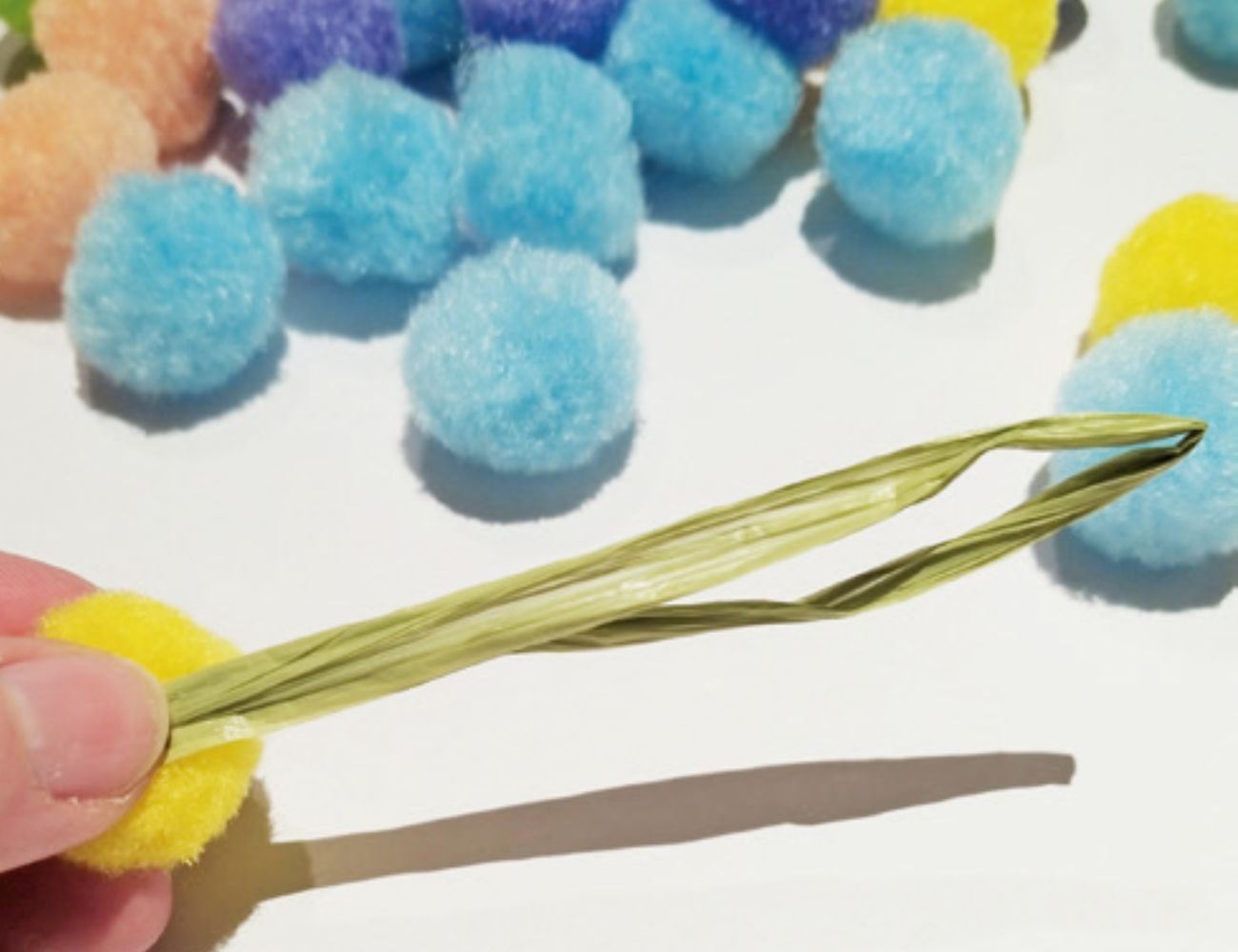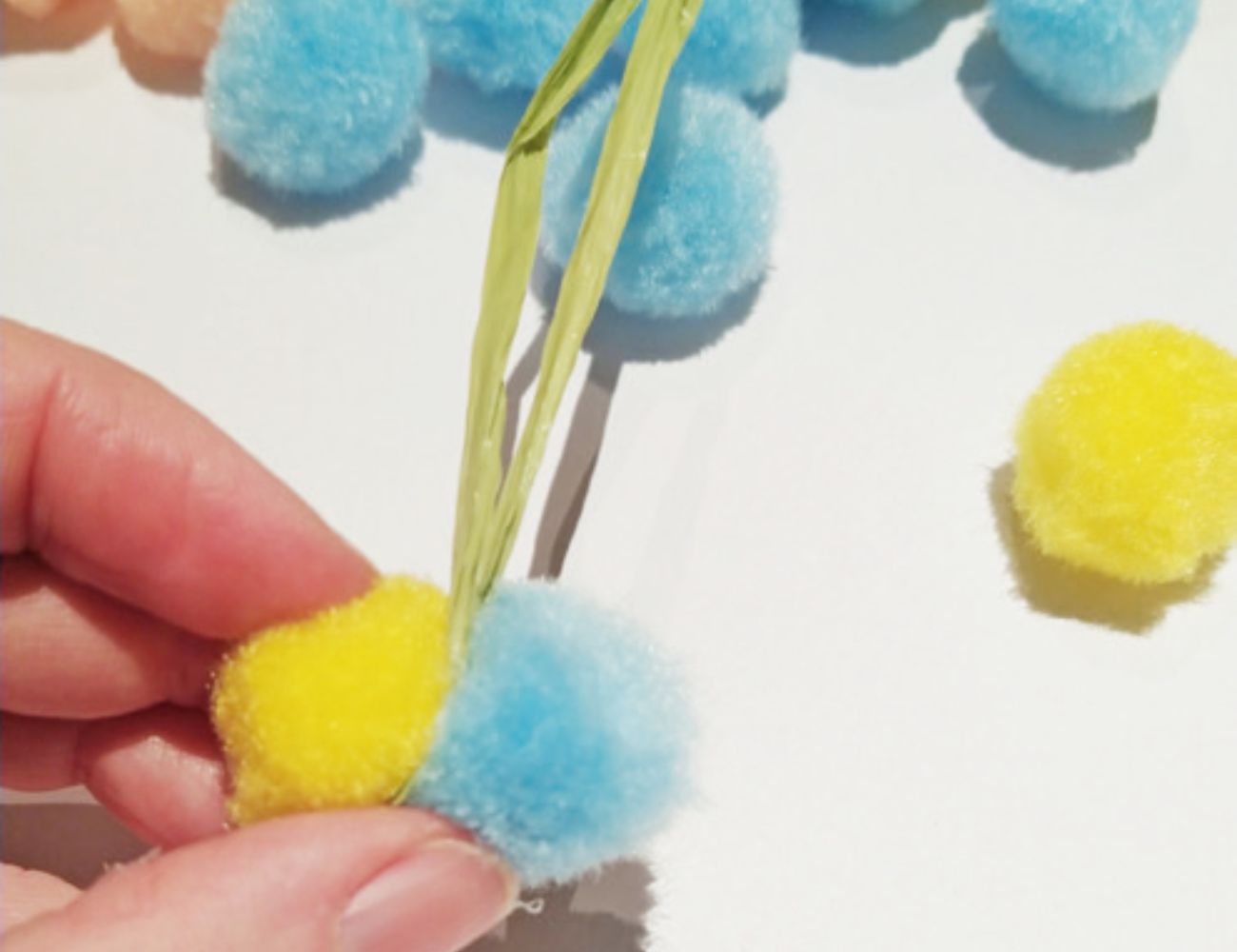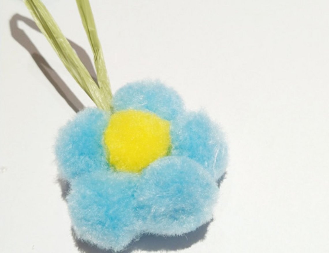 3. Klebe nun fünf andersfärbige Bommel im Kreis um den gelben. So entsteht deine Blume.