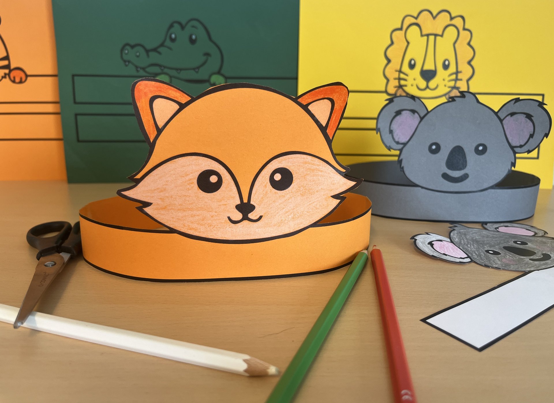 Druckt eure Wunsch-Tierkrone einfach auf buntes Papier aus.