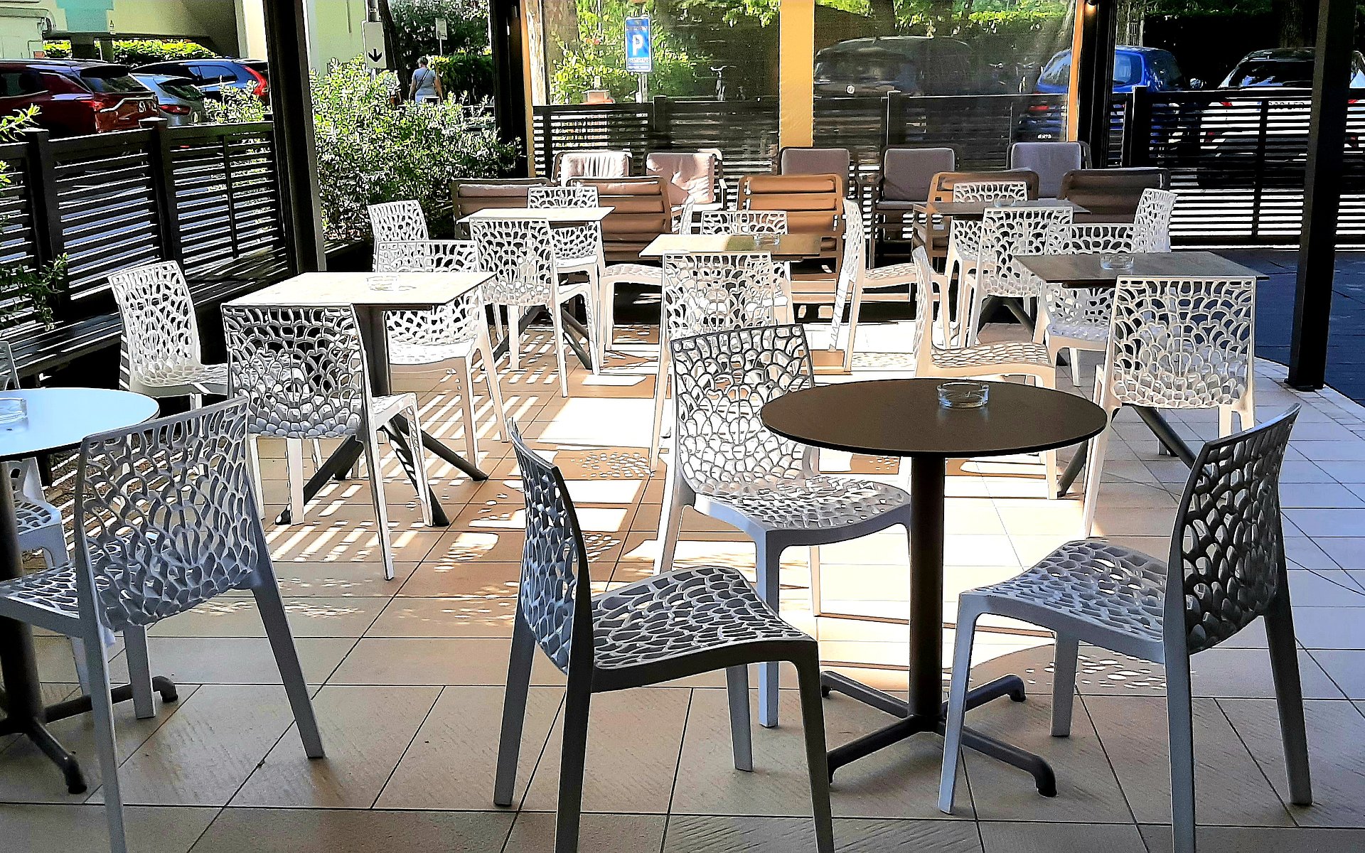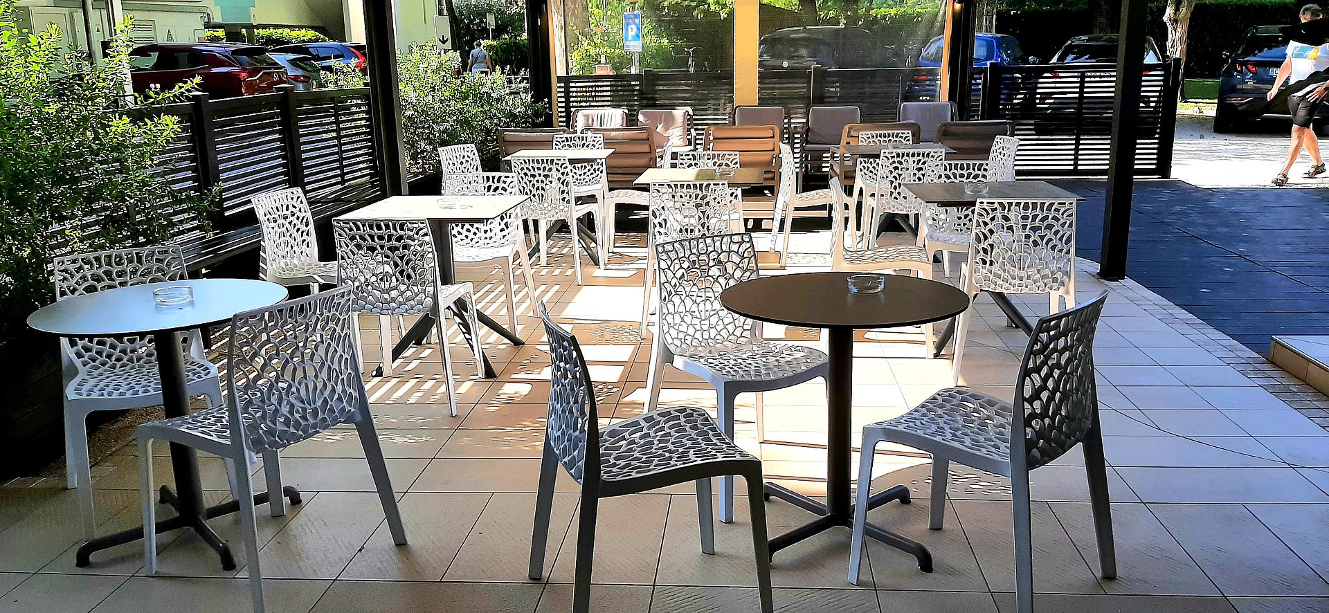 Direkt beim Hotel gibt es einen beschrankten Parkplatz. Bevor man das Hotel betritt, kann man es sich auf einer ebenerdig