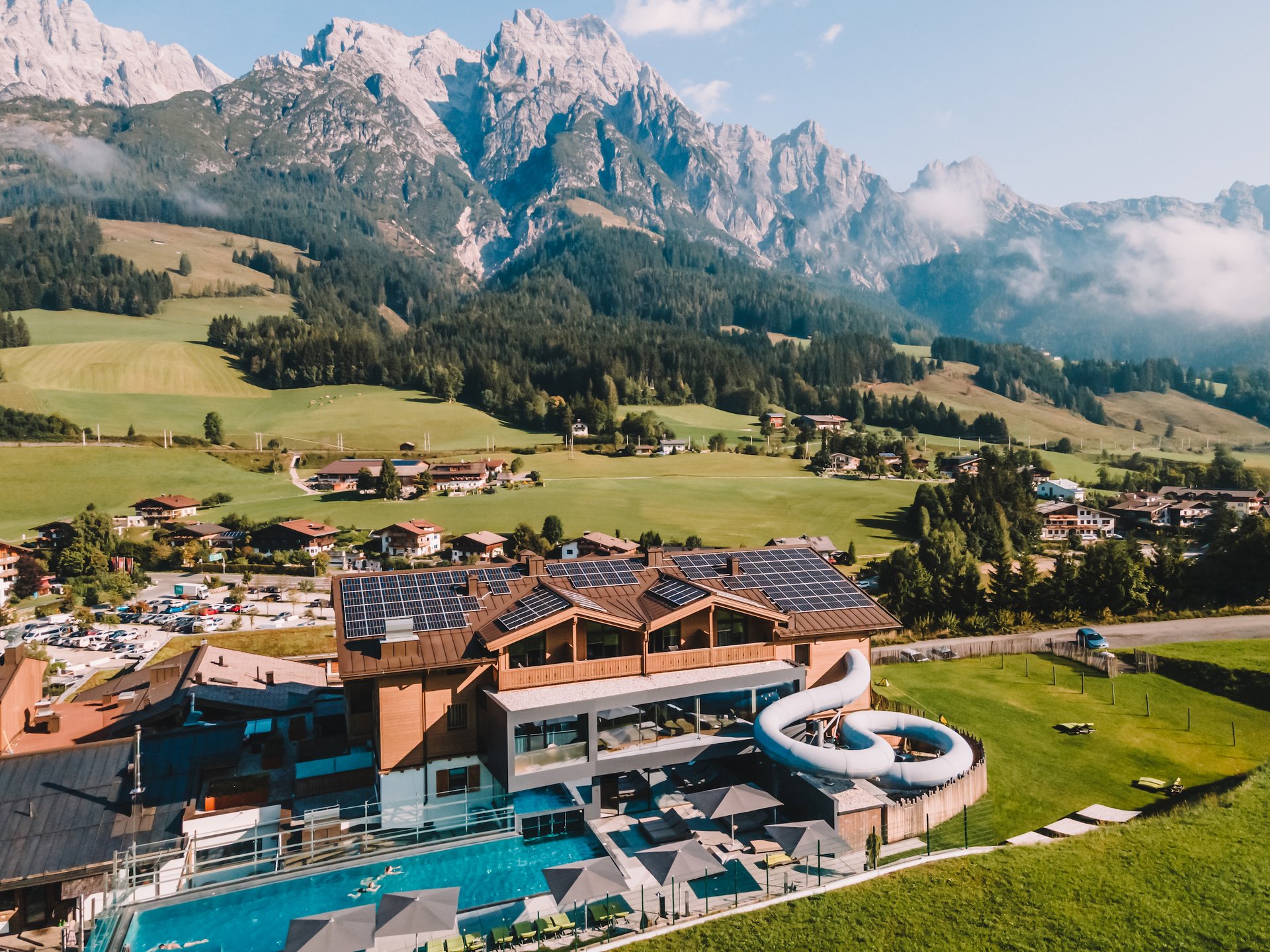 Durch die geniale Lage inmitten der Leoganger Steinberge und Kitzbüheler Alpen liegen die Erlebnisse sozusagen vor der Haustür. Dennoch kommen in der Riederalm Entspannung und Genuss nicht zu kurz. Die mit einem Michelin-Stern, einem grünen Stern und vier Gault- Millau- Hauben ausgezeichnete Küche im hauseigenen Gourmetrestaurant „dahoam“ zählt zu den allerbesten der Region – selbst die Halbpensionsküche trägt drei Hauben! Daneben verdient der vielfältige Wellnessbereich eine Erwähnung. Eines der Highlights ist der 20 Meter lange, 33 Grad warme Thermalaußenpool im Mountain Spa nur für Erwachsene, in dem auch zwei Saunen zur Auswahl stehen. Ohne Wenn und Aber darf im Familien-Hallenbad geplantscht und getobt werden.