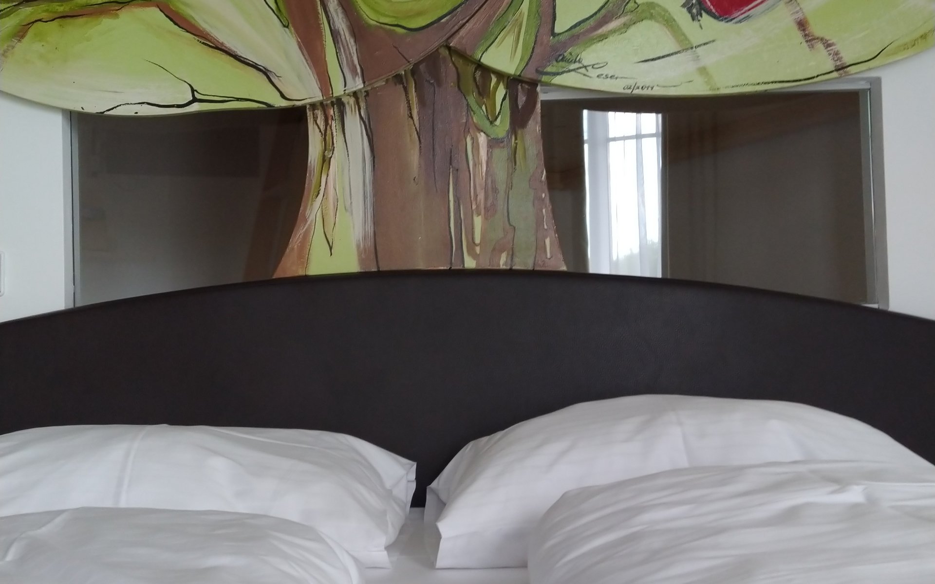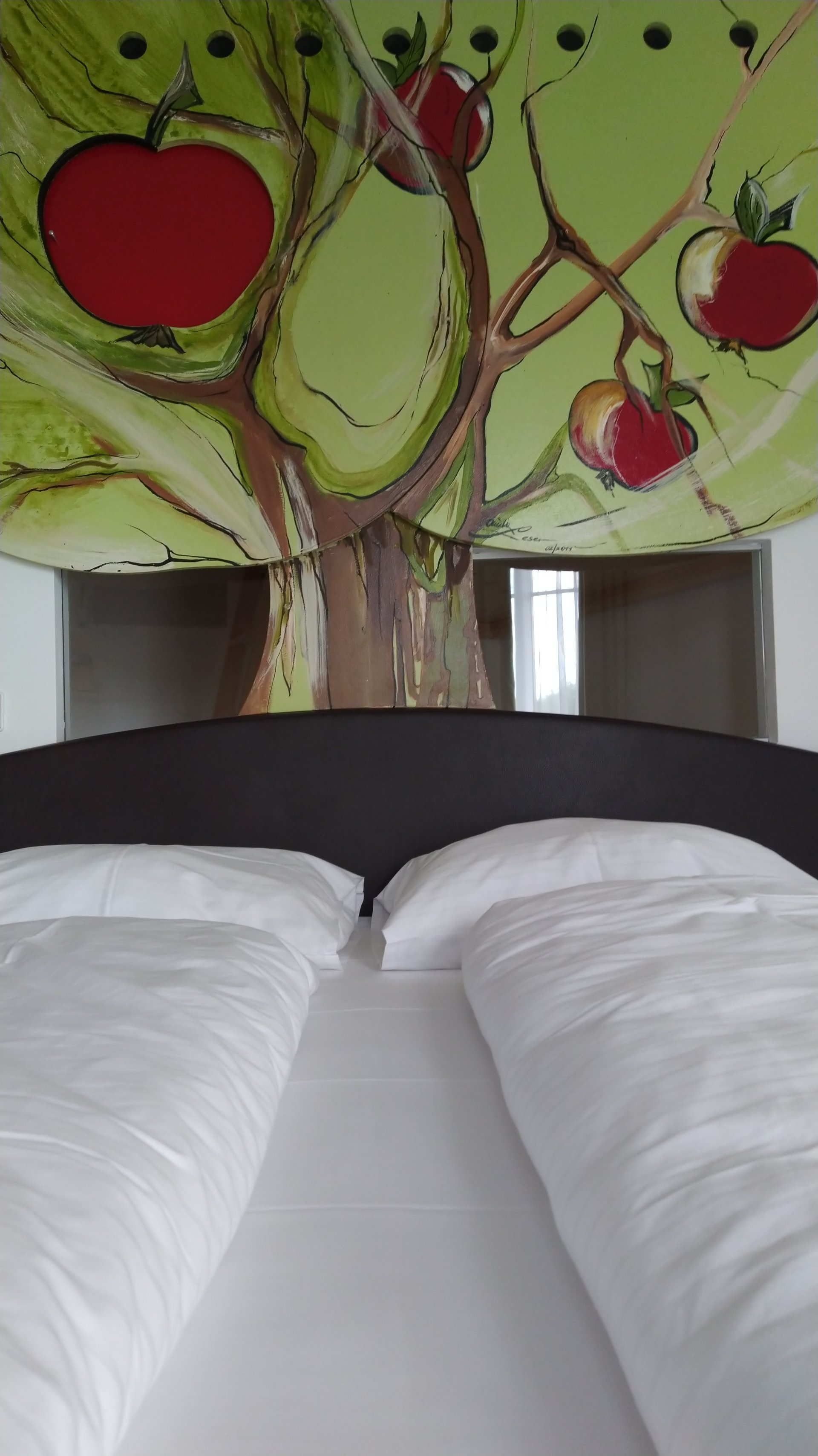 Neben ganz viel Action wurde in der familienfreundlichen Therme vor allem auch an die Kleinsten gedacht. „Angefangen vom Gratisleihkinderwagen mit Wanne oder Sportsitz, über Spielbereiche im Restaurant, der Garderobe und im Thermenbereich bis hin zu rollbaren Hochstühlen mit Tablett im Restaurant wurde hier an alles gedacht. Es gibt auch mehrere Wickelecken, Stillwaben und einen eigenen Ruheraum, um Kinder schlafen zu legen“, beschreibt Magdalena das Angebot. Und „Schlafen“ ist jetzt auch das Stichwort. Nach einem ausgedehnten Thermennachmittag ziehen sich die Kinder in ihre Obstbaumbettchen zurück. Die Eltern gönnen sich noch einen Drink von der Selbstbedienungsbar in der Pension und genießen den Sonnenuntergang auf der Terrasse, die man direkt vom Zimmer aus erreicht. „Zum Wohl! Auf einen gelungenen ersten Urlaubstag!“