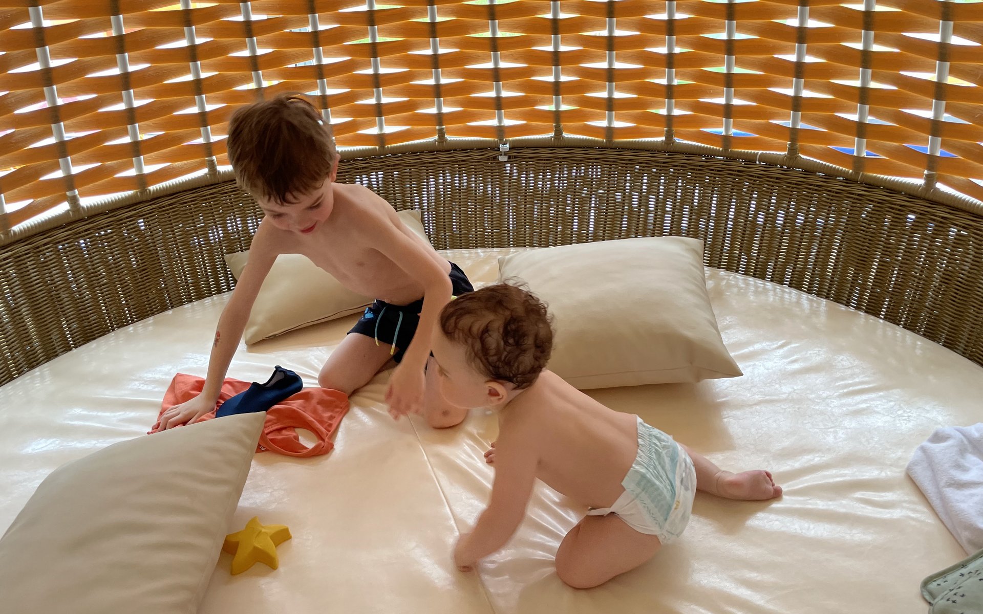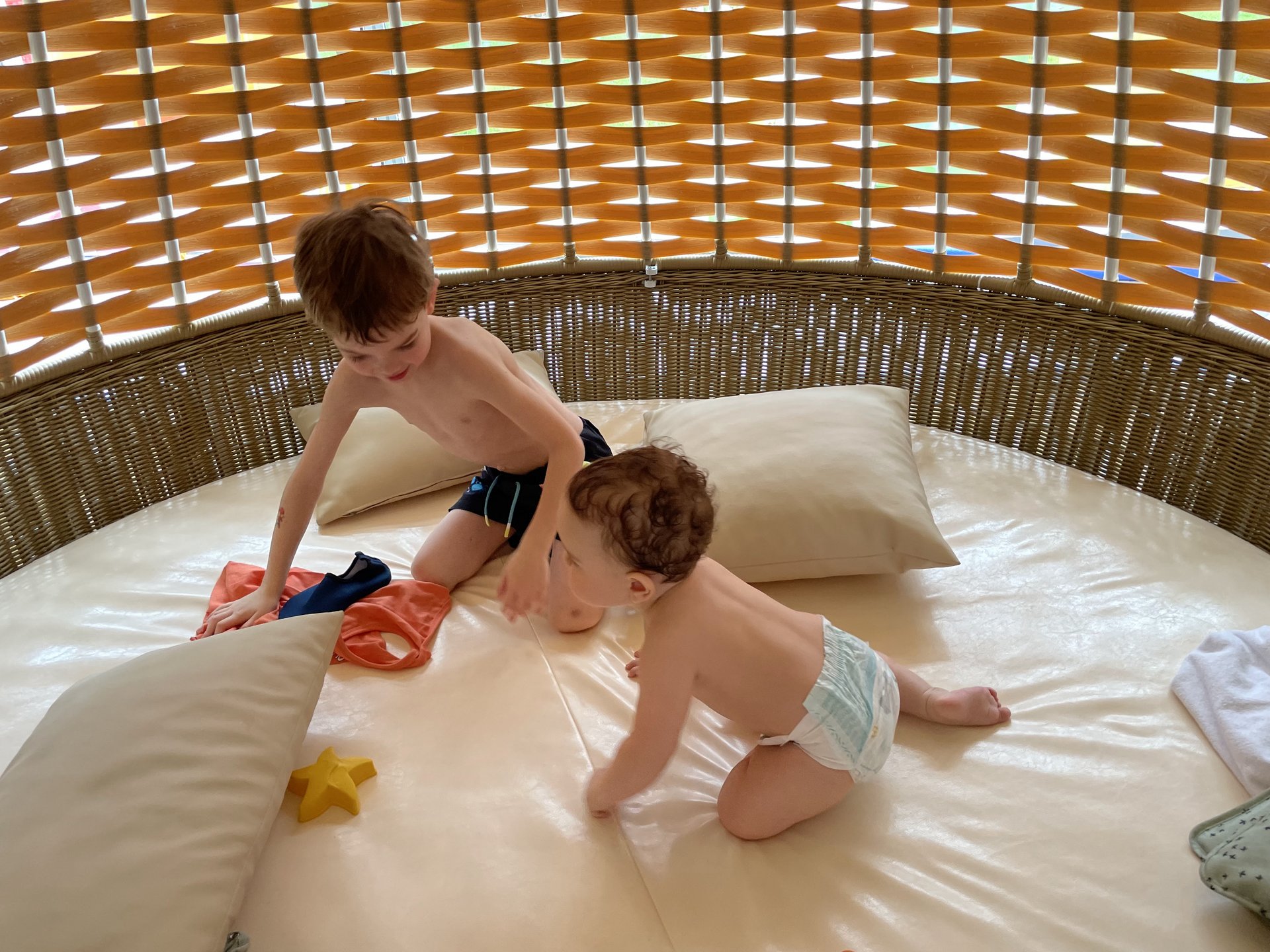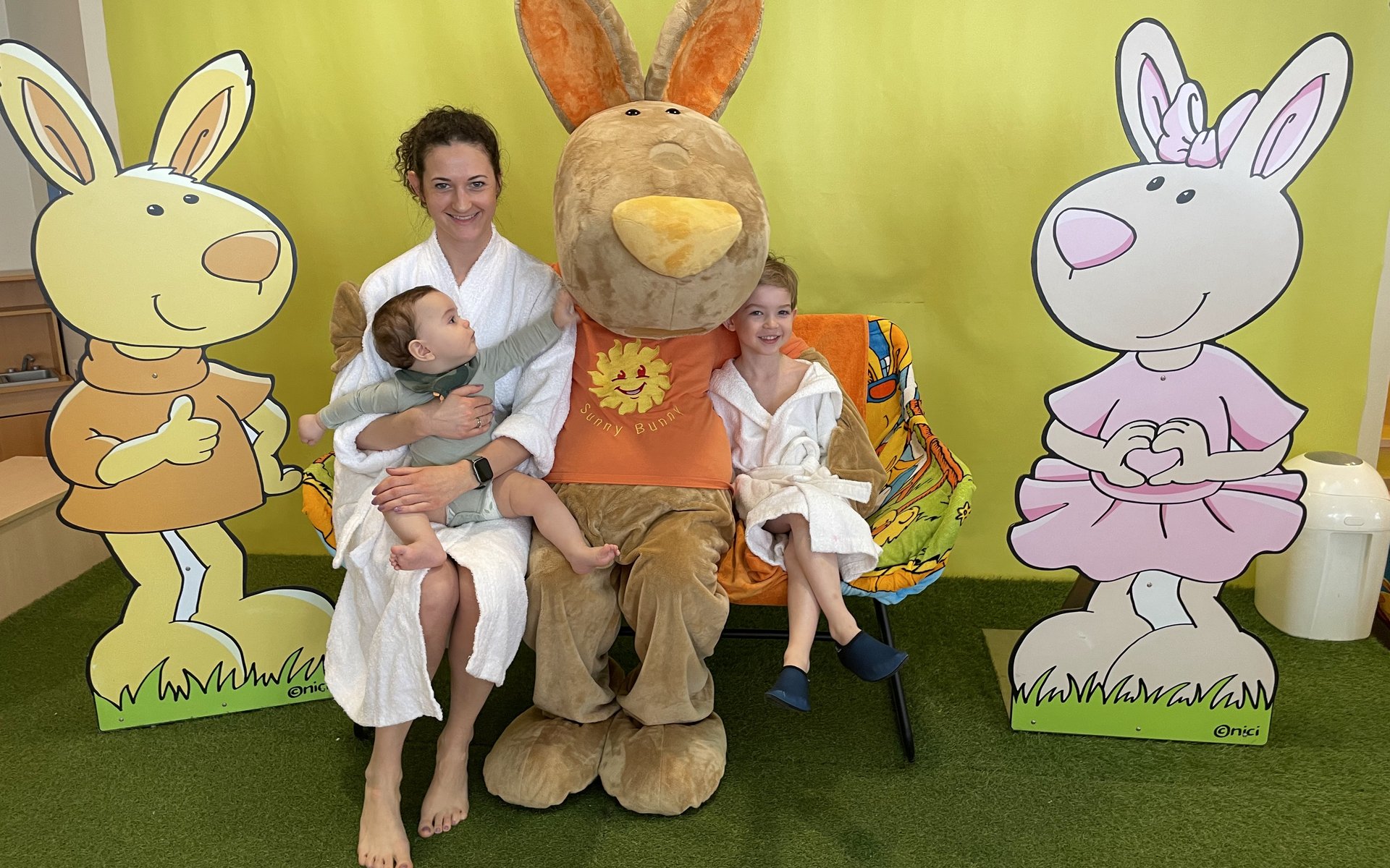 Sonne ist hier, rund um die Sonnentherme und die Pension Sonnengarten, kein Marketing, sondern ein immer währender Begleiter. Übrigens hat das Burgenland die meisten Sonnenstunden Österreichs. Und das erlebt man schon, wenn man am Morgen im Zimmer Zwetschke erwacht, in den Garten blickt und die Morgensonne die weite Ebene und die Therme, die sich ja in Sichtweite befindet, in ein goldgelbes Licht taucht. Ein weiterer toller Tag erwartet die Urlaubsgäste in Lutzmannsburg. „Nach einem Frühstücksbuffet, das keine Wünsche offen lässt, erkundeten wir noch den Indoor-Spielraum der Pension, bevor es wieder in die Therme ging.“ Während Julian zufrieden im Baby- und Kleinkindbereich spielt, weiß Leon gar nicht, was er zuerst machen soll, so vielfältig ist das Angebot – Brettspiele, Mini-Küche, Fahrzeuge, Tischfußball, Kreidetafel, Riesen-Bausteine und vieles mehr. „Während meine drei Männer spielten, konnte ich in Ruhe alles für unseren zweiten Thermentag zusammenpacken“, erzählt Magdalena. Und dann ist es auch schon wieder so weit. Unsere moreFAMILY-Reporter: innen tauchen ab in das wohlig warme Wasser der Sonnentherme Lutzmannsburg. Und abends machen sie sich mit vielen unvergesslichen Familienmomenten im Herzen und dem Maskottchen Sunny Bunny aus Plüsch in den Kinderhänden, zurück auf den Heimweg nach Wien.