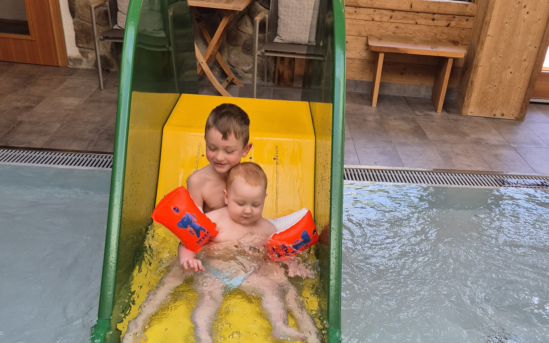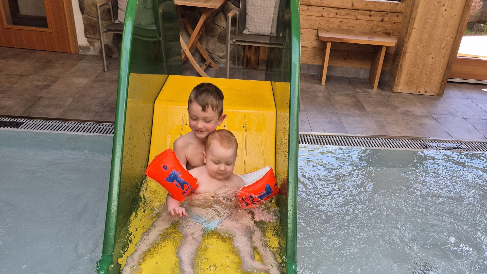 Von einem Höhepunkt zum nächsten. Der „Spa-Lift“ bringt Hotelgäste schnurstracks in den Bade- und Wellnessbereich. „Das Zwergerlbad war richtig cool!“, ist Liam begeistert. Aber auch sein kleiner Bruder Noah kam im Kinderbecken mit Wasserrutsche, -attraktionen und -spielsachen voll auf seine Kosten. In- und Outdoorpool, Sportbecken, Babybecken, Familiensaunen, Infrarotkabine, „Stille Alm“ mit Heuboden- Flair, Poolbar, Infinity-Whirlpool mit Bergblick, Rooftop-Whirlpool und Naturteich – Wellness-Herz, was willst du mehr?